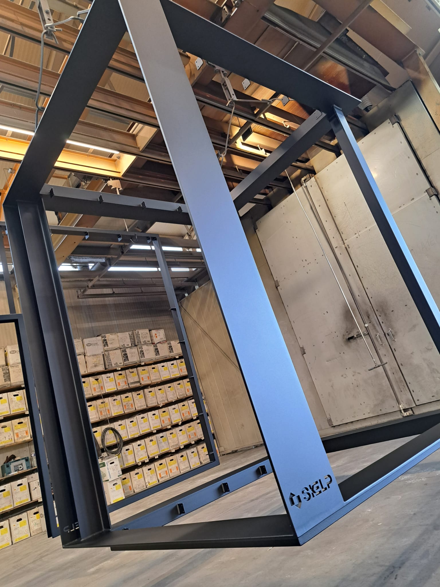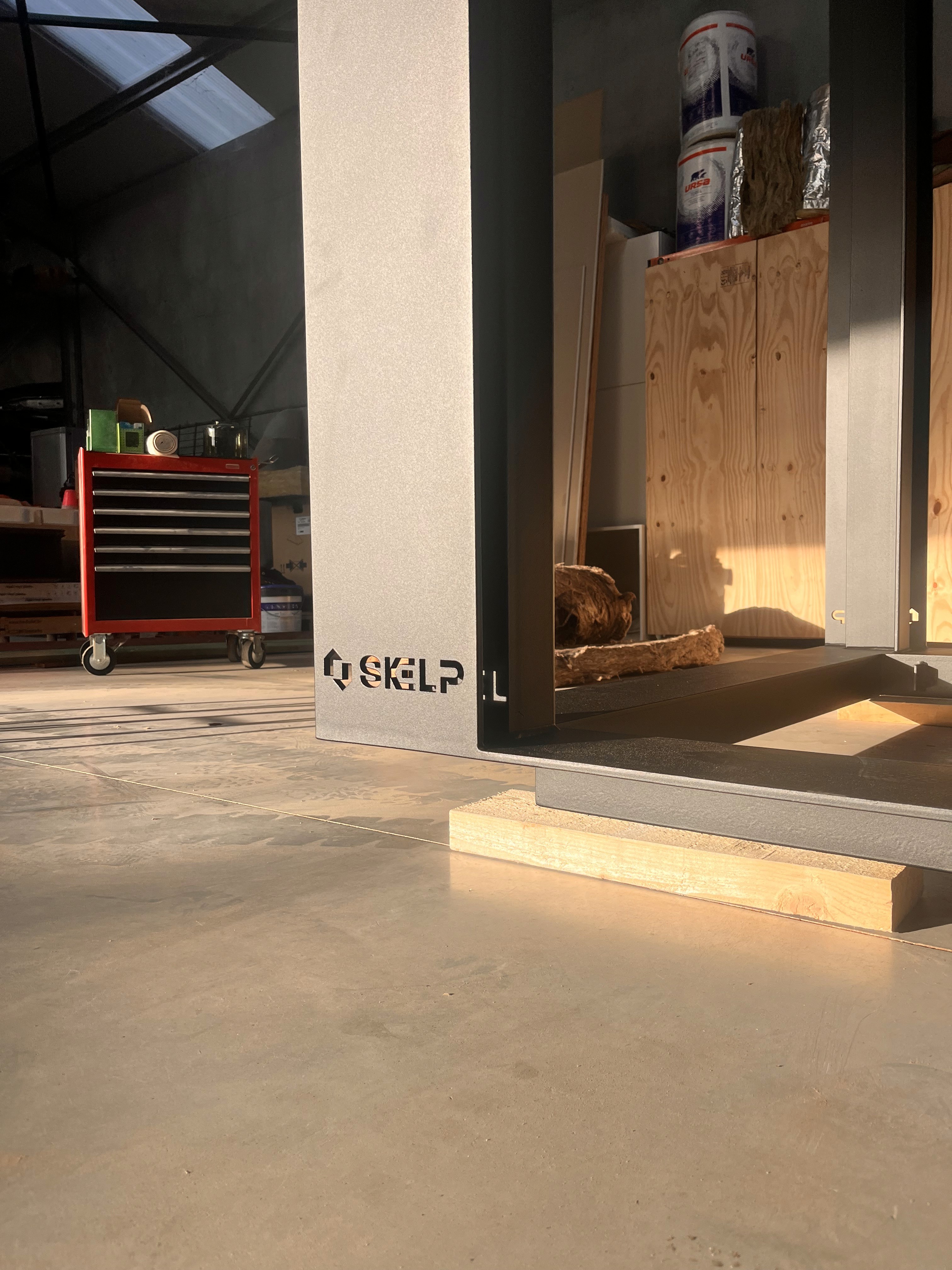 Voor de afwerking kiezen we duurzame, onderhoudsarme materialen zoals gebrand hout of thermisch behandeld hout, die mooi verouderen en passen in een sobere, tijdloze architectuur. De identiteit van Skelp is bewust discreet aanwezig: het logo wordt ingefreesd in het stalen frame en maakt zo integraal deel uit van de constructie, niet als toevoeging maar als onderdeel van het geheel.